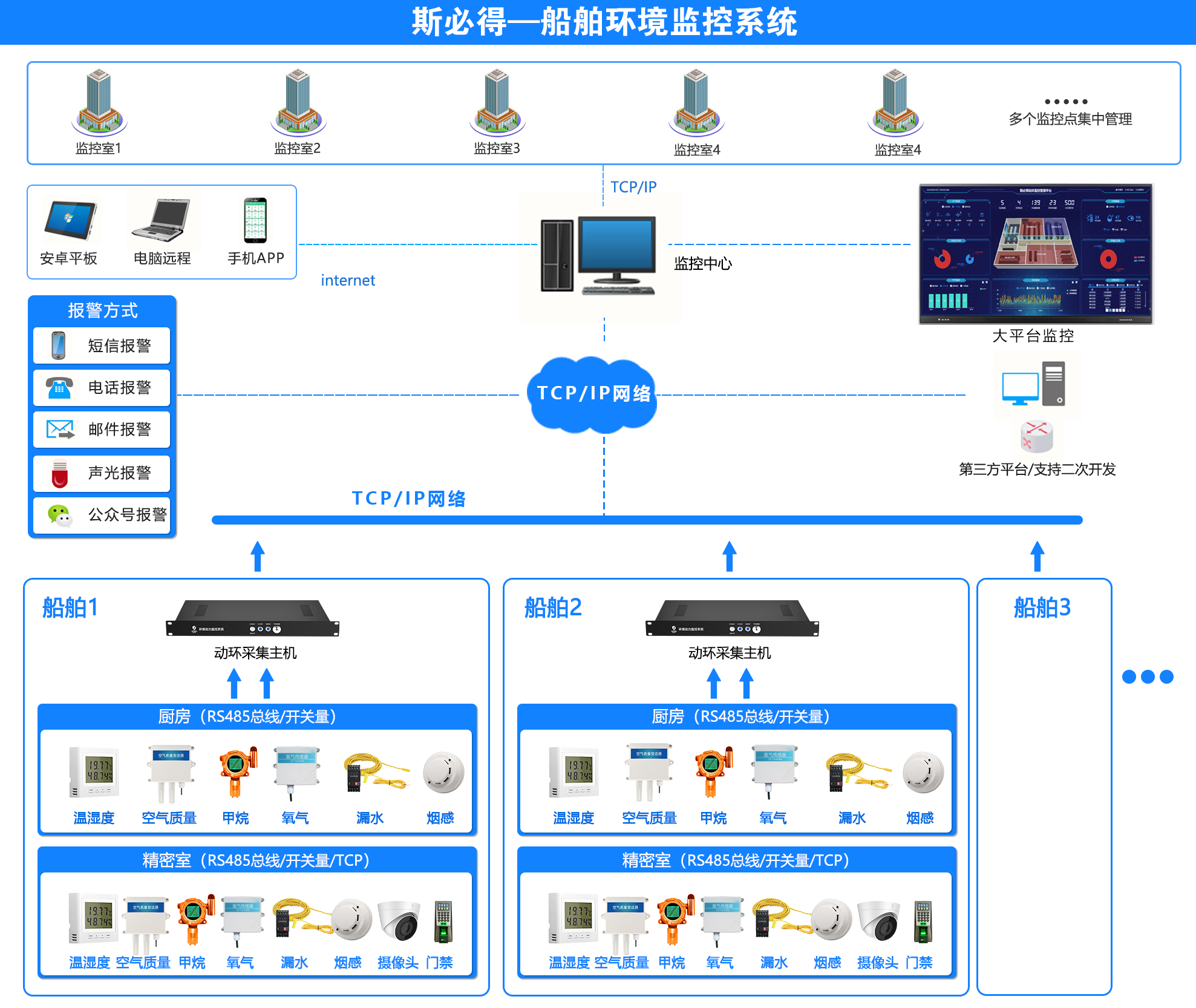 船艙環境監測系統的前端采集設備主要包含了不同艙室內的傳感器模塊。主要監測內容包含溫濕度、空氣質量、漏水、煙感、甲烷、氧氣、門禁及視頻等,通過監控中心,實現遠程管理、APP管理、大屏監控,具有語音報警、微信公眾號報警、短信報警、聲光報警以及郵件報警等方式,完成對船艙內部環境參數的實時監測。