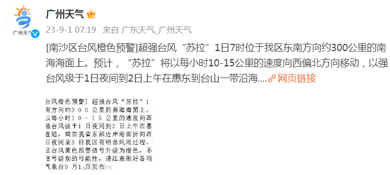 另外據市氣象臺監測,廣州市達到啟動氣象災害(臺風)Ⅲ級應急響應標準。市氣象災害應急指揮部決定從9月1日2時56分起將廣州市氣象災害(臺風)Ⅳ級應急響應升級為Ⅲ級應急響應。請按照預案規定做好防御工作。