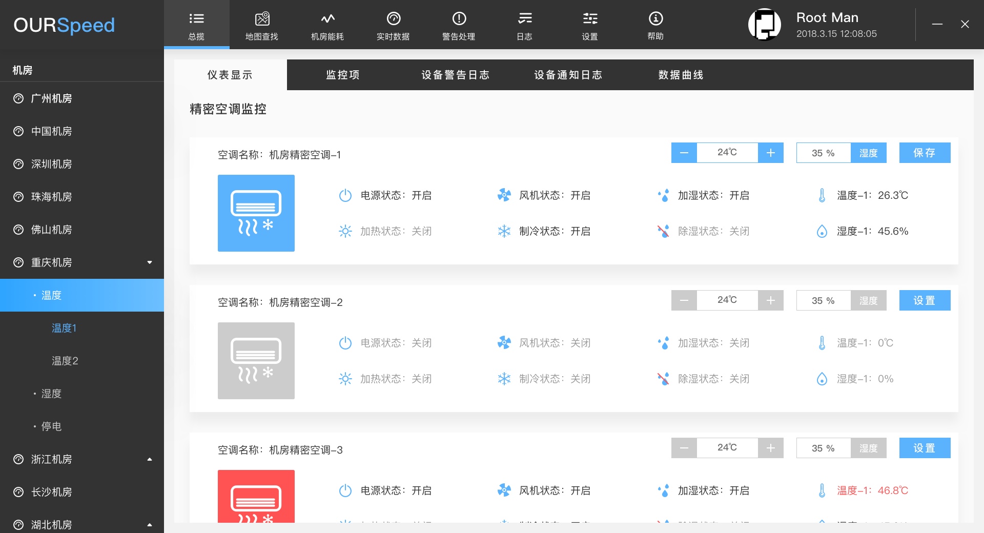 動(dòng)力環(huán)境監(jiān)控系統(tǒng)聯(lián)動(dòng)空調(diào)、除濕機(jī)、風(fēng)機(jī)等來調(diào)節(jié)機(jī)房溫濕度,機(jī)房的主要熱量來自于設(shè)備的散熱、太陽輻射熱、照明等,其中設(shè)備運(yùn)行產(chǎn)生的熱量是機(jī)房中的主要熱源,溫度過高過低都不利于設(shè)備的運(yùn)行,因此一個(gè)智能化的環(huán)控系統(tǒng)就顯得非常重要。